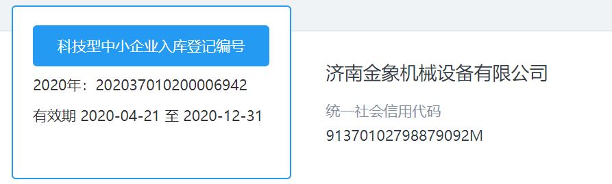 根據(jù)《科技型中小企業(yè)評(píng)價(jià)辦法》(國(guó)科發(fā)政〔2017〕115號(hào))和省科技廳《關(guān)于開(kāi)展2020年科技型中小企業(yè)評(píng)價(jià)工作的通知》等文件有關(guān)規(guī)定,現(xiàn)認(rèn)定濟(jì)南金象機(jī)械設(shè)備有限公司成為“國(guó)家科技型中小企業(yè)”,編號(hào):202037010200006942。